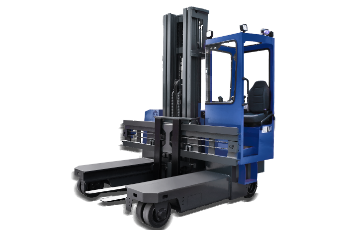 ●電動4ウェイフォークリフトは、長尺物搬送用の特殊フォークリフトで、直進、横移動、その場での回転機能を備え、積載量は3トンです。